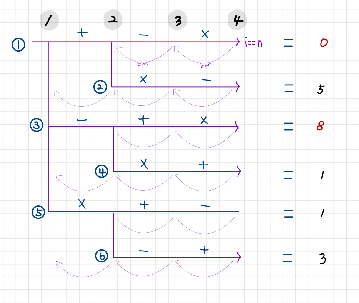 다시말해, 1 + 2 - 3 x 4 를 계산해 나온 결과값인 0을 처음 저장하고, 그 다음 1 + 2 x 3 - 4 를 계산해 그 결과값인 5를 이전 결과값과 비교하여 저장하는 과정을 총 경우의 수 6번만큼 반복하게 된다.